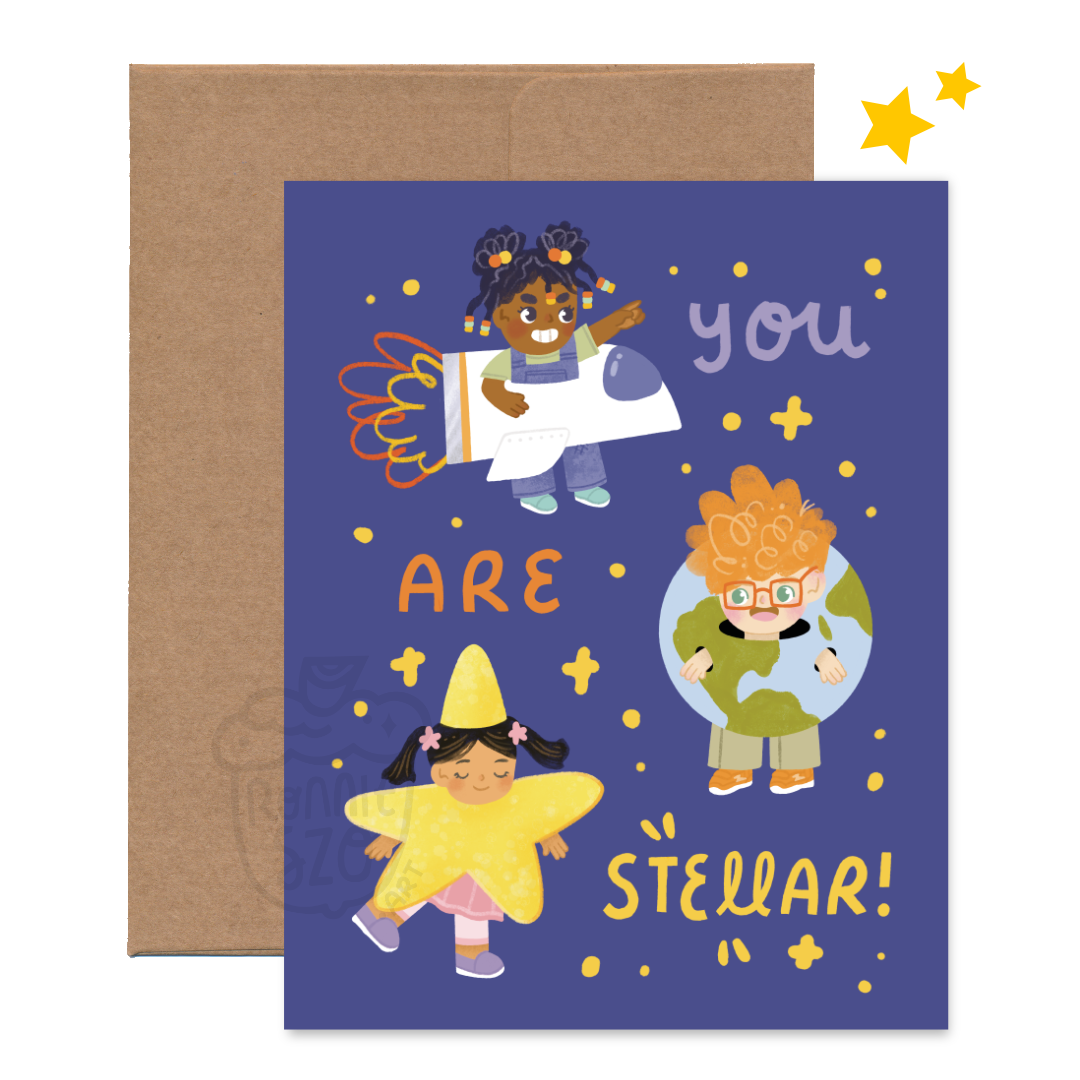 A greeting card design, featuring three kids in a play wearing different space related costumes.