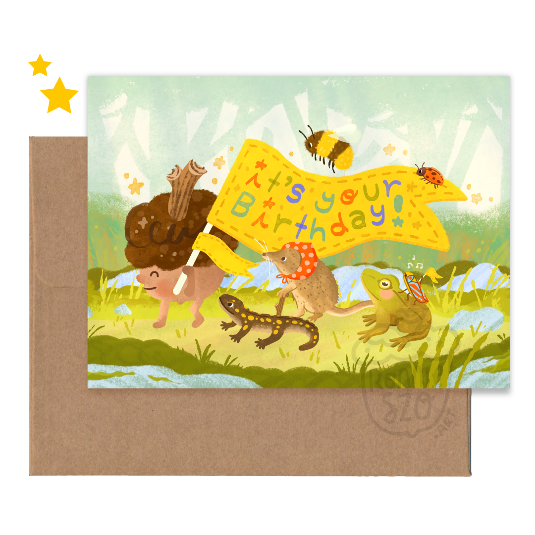 The illustration features an acorn, a Yellow Spotted Salamander,an Eastern Shrew, a Green Frog, a Candy-Stripped Leafhopper, a Bumblebee, and a Ladybug.